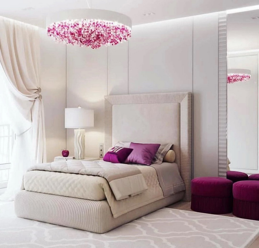 ถ้าหากไม่ต้องการให้สี Viva Magenta มีมากเกินไป สามารถเลือกเอาเฟอร์นิเจอร์และของแต่งบ้านบางส่วนมาใช้ ตัดกับของใช้สีขาวในบ้านได้ อย่างไอเดียนี้ ใชเพียงหมอน และเก้าอี้สตูลเท่านั้น ซึ่งก็สามารถดึงสี Viva Magenta ออกมาได้อย่างโดดเด่น (Source: YB INTERIORS | tuacasa)