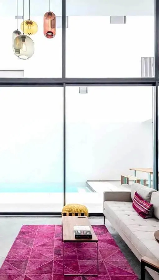 เช่นเดียวกับห้องนั่งเล่นห้องนี้ ที่แต่งด้วยสไตล์โมเดิร์นทันสมัย เปิดรับแสงธรรมชาติด้วยหน้าต่างบานใหญ่ และตกแต่งด้วยพรมปูพื้นสี Viva Magenta แบบเข้ากัน ให้ความรู้สึกที่อบอุ่นและผ่อนคลาย (Source : vivadecora)