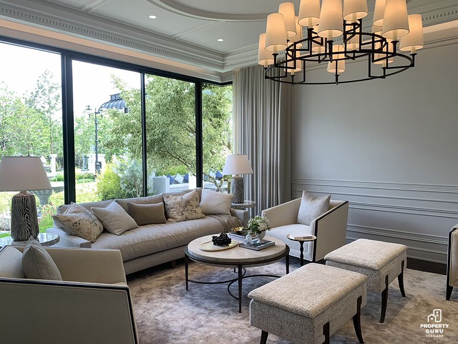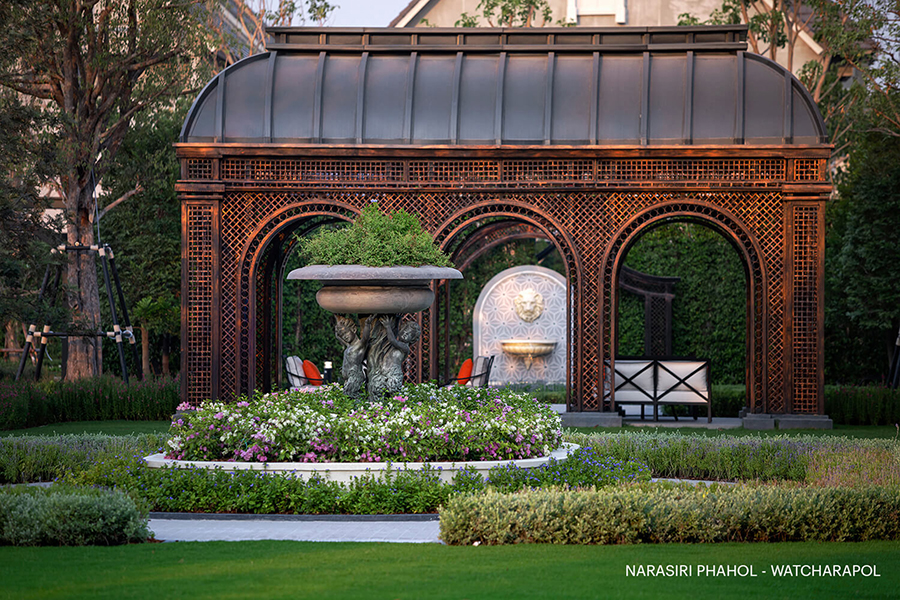 พาวิลเลียนทรงกลาสเฮาส์ ทำจากเหล็กดัดงานคราฟท์ แรงบันดาลใจจากหอไอเฟล Le Club คลับเฮาส์ขนาดใหญ่ ในตำแหน่งที่สวยที่สุดของโครงการ ท่ามกลางทะเลสาบ สวนส่วนกลางแรงบันดาลใจจากพระราชวังแวร์ซาย อาทิ หลังคาทรงกลาสเฮ้าส์ ภายในตกแต่อย่างในแบบฉบับของฝรั่งเศส อาทิ