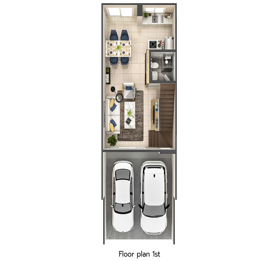 - พื้นที่ชั้นล่างเปิดกว้างแบบ Open plan สามารถจัดสรรฟังก์ชันการใช้งานได้ตามจริง ปรับเปลี่ยนพื้นที่ได้ตามต้องการ และยังออกแบบห้องน้ำชั้นล่างให้สามารถใช้งานได้เหมือนชั้นอื่นๆ เพื่อรองรับการทำห้องนอนผู้สูงอายุ