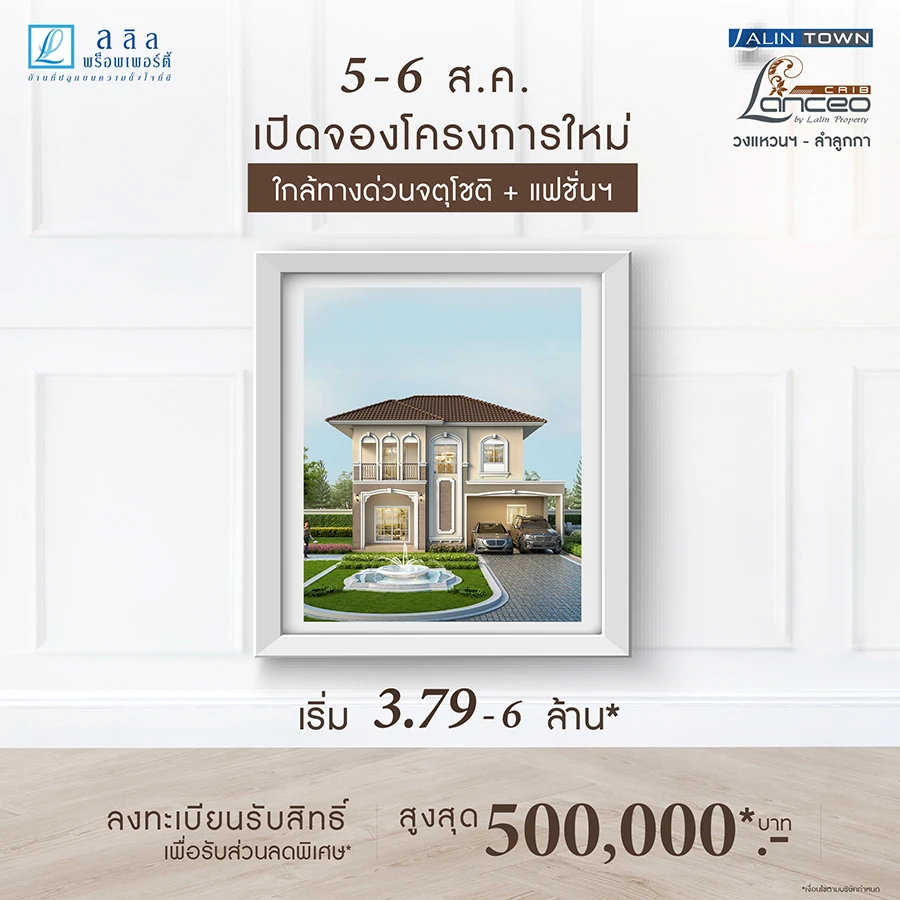 โครงการ Lalin Town Lanceo Crib วงแหวนฯ - ลำลูกกา คลอง 6 พร้อมเปิดให้จองราคาพิเศษในวันที่ 5-6 ส.ค. นี้ ลดสูงสุด 500,000 (เงื่อนไขเป็นไปตามที่บริษัทฯ กำหนด) โดยจะสร้างแล้วเสร็จบางส่วนในเดือนกันยายน 2566 ท่านที่สนใจสามารถลงทะเบียนเพื่อรับสิทธิพิเศษได้ที่นี่ได้ที่ https://bit.ly/3OtJpEn