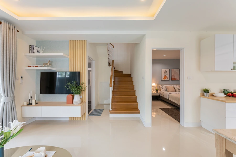 โซนนั่งเล่น/รับแขกที่โล่งยาวไปจนสุดหลังบ้าน