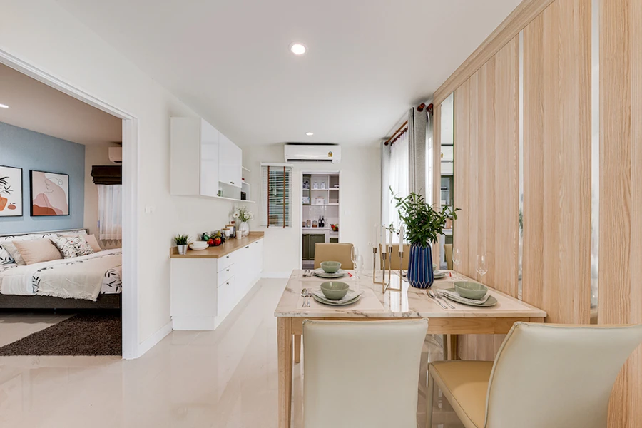 พื้นที่รับประทานอาหารและเคาน์เตอร์ครัว หากชอบทำอาหารก็ต่อเติมครัวไทยที่หลังบ้านได้