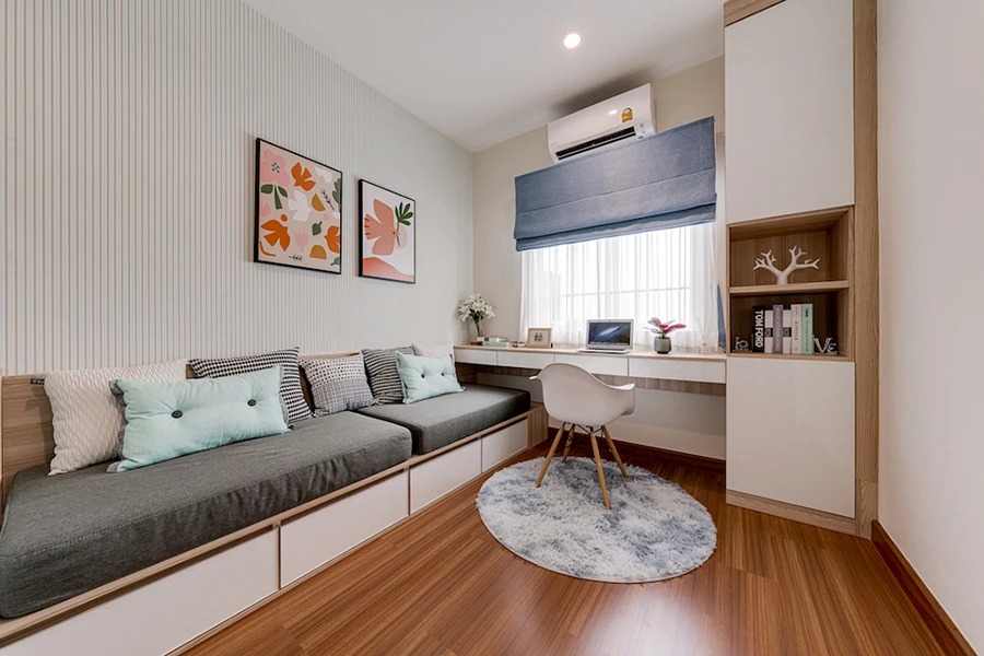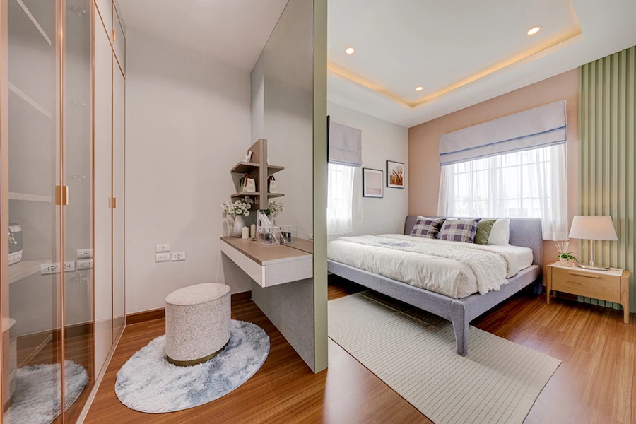 ห้องนอนโล่งๆ สามารถกั้น Partition แบ่งสัดส่วนเป็นโซนแต่งตัวได้ด้วย