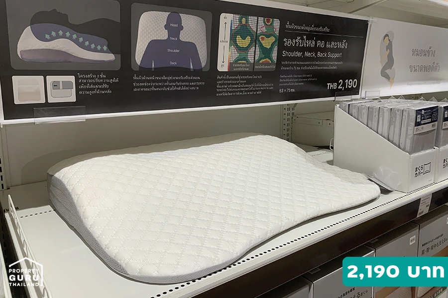 แต่เราไปเตะตาหมอนตัวนี้ที่ค่อนข้างแบนและไล่ระดับลงมาจากหัวถึงหลัง ทำให้รองรับสรีระครบส่วน กระจายแรงกดขณะนอนหลับ ทำให้หลับสบาย
