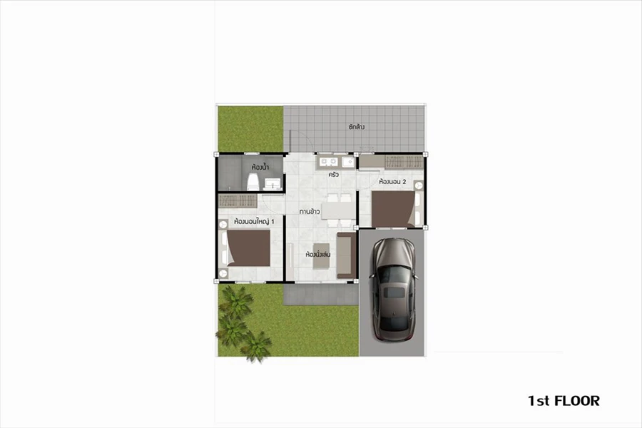 2. แบบบ้านธราดล พื้นที่ใช้สอย 62 ตร.ม. ที่ดินเริ่มต้น 20 ตร.วา หน้ากว้างถึง 8 ม. ประกอบไปด้วย 2 ห้องนอน 1 ห้องน้ำ และจอดรถได้ 1 คัน