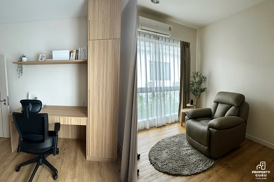 ห้องนี้เป็นห้องทำงาน ที่ไว้ทำงาน WFH เก็บของ และมีตู้สไลด์ไว้เก็บที่รีดผ้าไอน้ำและเตรียมผ้าสำหรับรีด