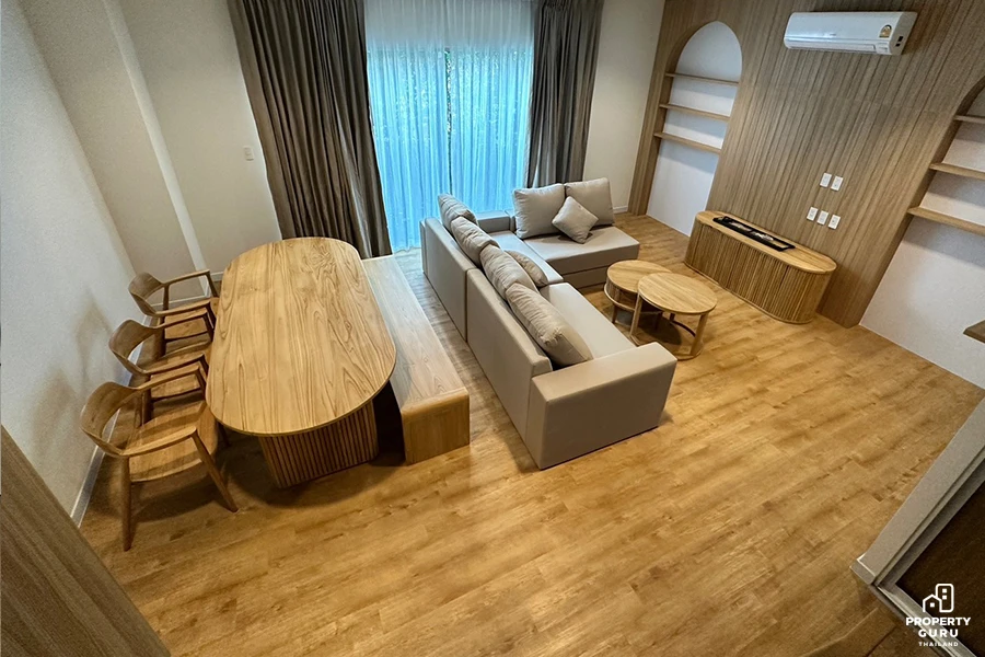 เฟอร์นิเจอร์เลือกสีธรรมชาติคุมโทนไปแนวทางเดียวกันทั้งหมด โซฟาสั่งผลิตวัดตามขนาดเลือกสีผ้า