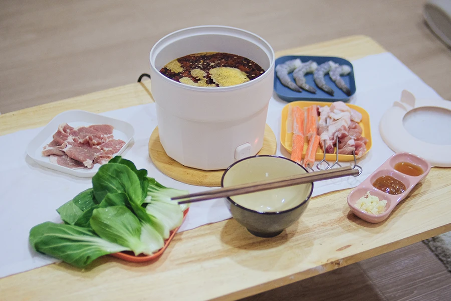 อุปกรณ์สำคัญของการทำหม่าล่าหม้อไฟก็ต้องยกให้ หม้อไฟฟ้า ใครคุมโทนห้องแนะนำหม้อรุ่นนี้ หม้อสีเบจดีไซน์มินิมอล เคลือบกันติดกะทะ ใช้ได้ทั้งต้มและทอด มีรูระบายความร้อน และสำหรับคนติดมือถือ ฝาหม้อมีที่วางมือถือไว้ดูซีรีส์ตอนทานหม่าล่าอร่อยๆ ได้ด้วย ครบจบในหม้อเดียว