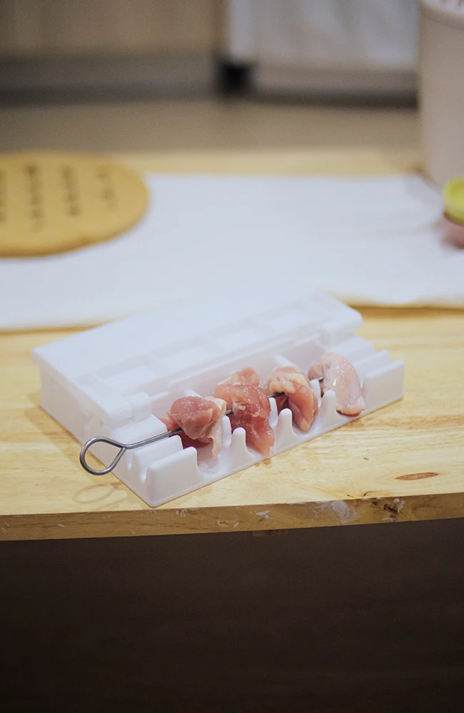 ใครสายขี้เกียจ อุปกรณ์ทุ่นแรงให้คุณเสียบวัตถุดิบต่างๆ ได้ง่ายขึ้น เพียงแค่นำวัตถุดิบวางตามช่อง พับฝาลง จากนั้นเสียบไม้เข้าไป นอกจากเสียบวัตถุดิบสำหรับทำหม่าล่าแล้ว ยังใช้เสียบลูกชิ้นหรือบาร์บีคิวได้อีกด้วย