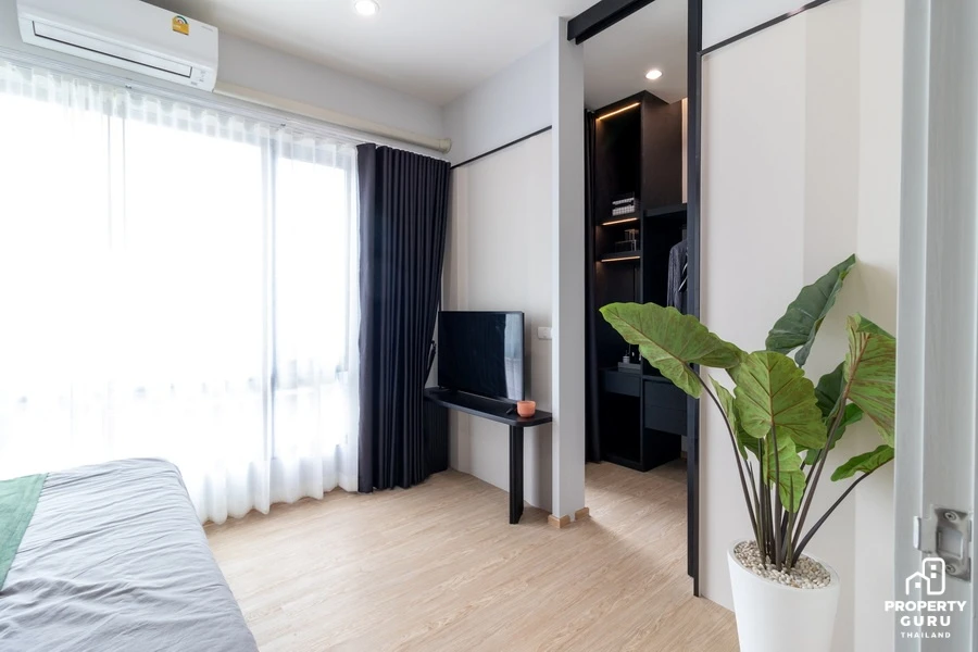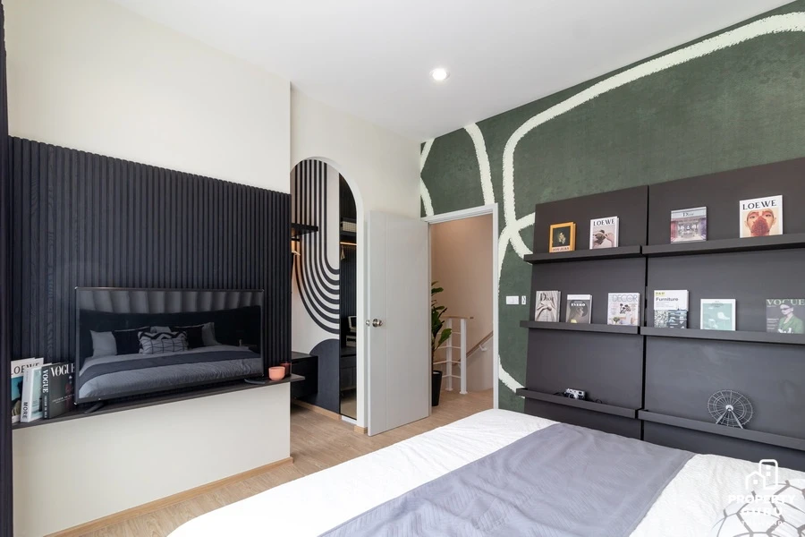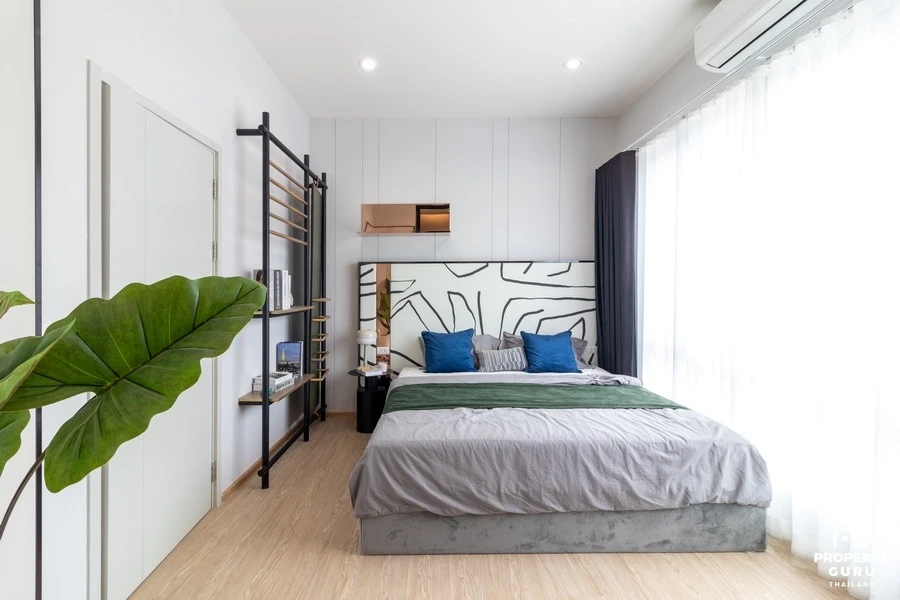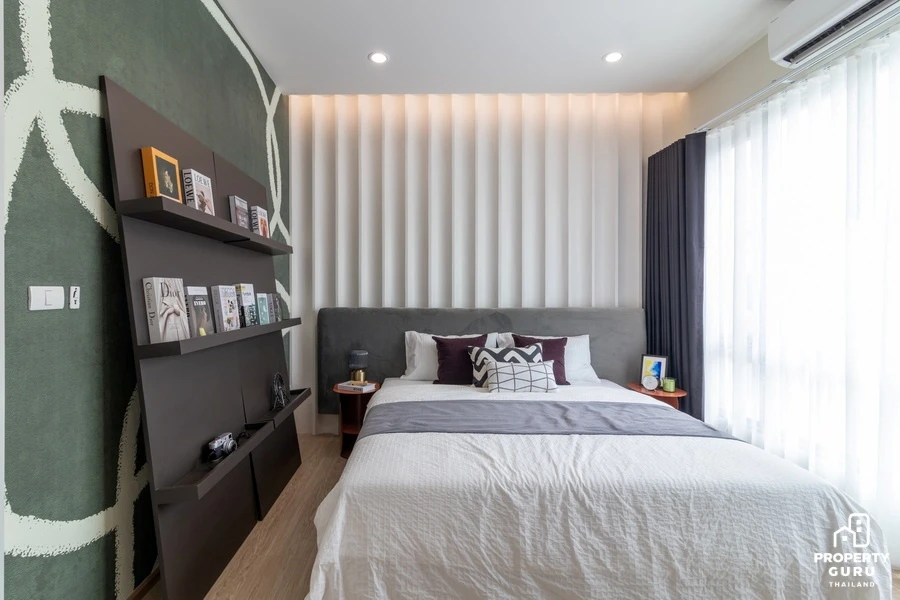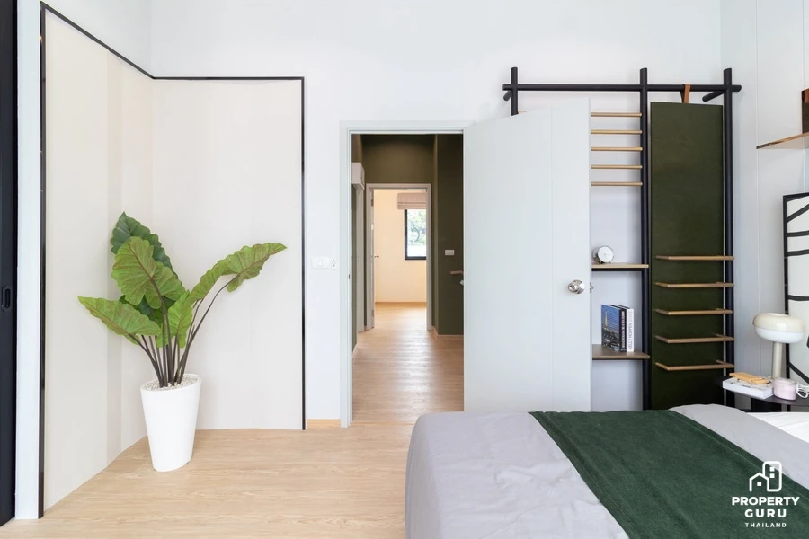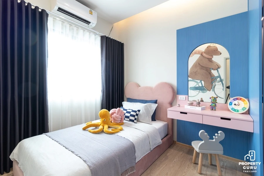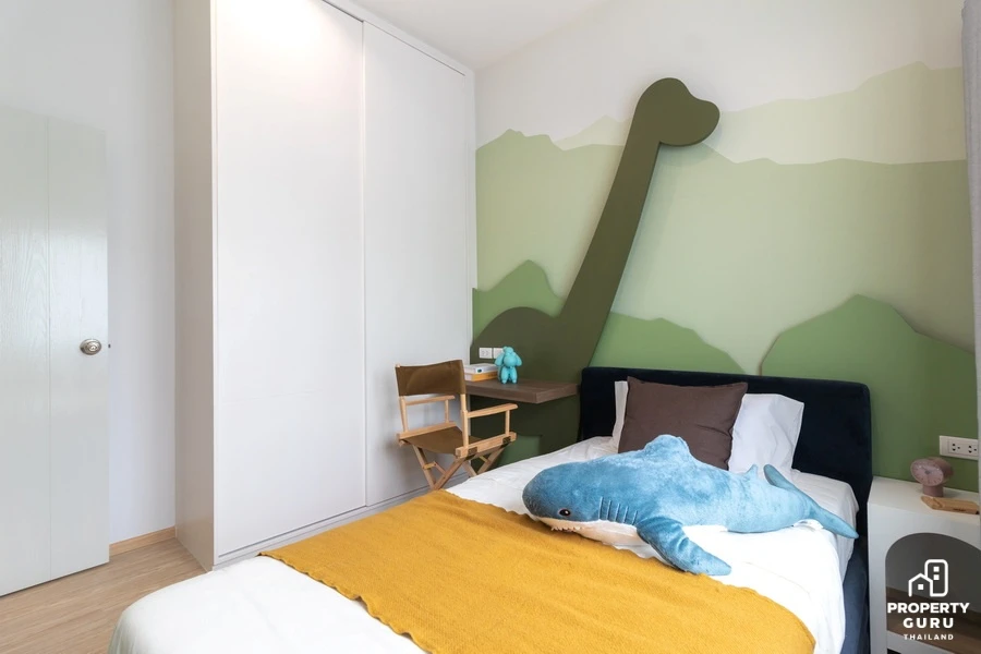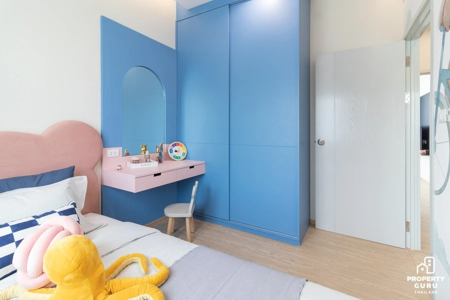 เหมาะสำหรับหรับเป็นห้องนอนเด็ก พื้นที่ข้างเตียงยังสามารถ Built in โต๊ะเครื่องแป้ง และตู้เสื้อผ้าสูงจรดฝ้า นอกจากจะเก็บเสื้อผ้าและของใช้ได้เยอะแล้ว ยังช่วยเพิ่มพื้นที่เก็บของได้ด้วย