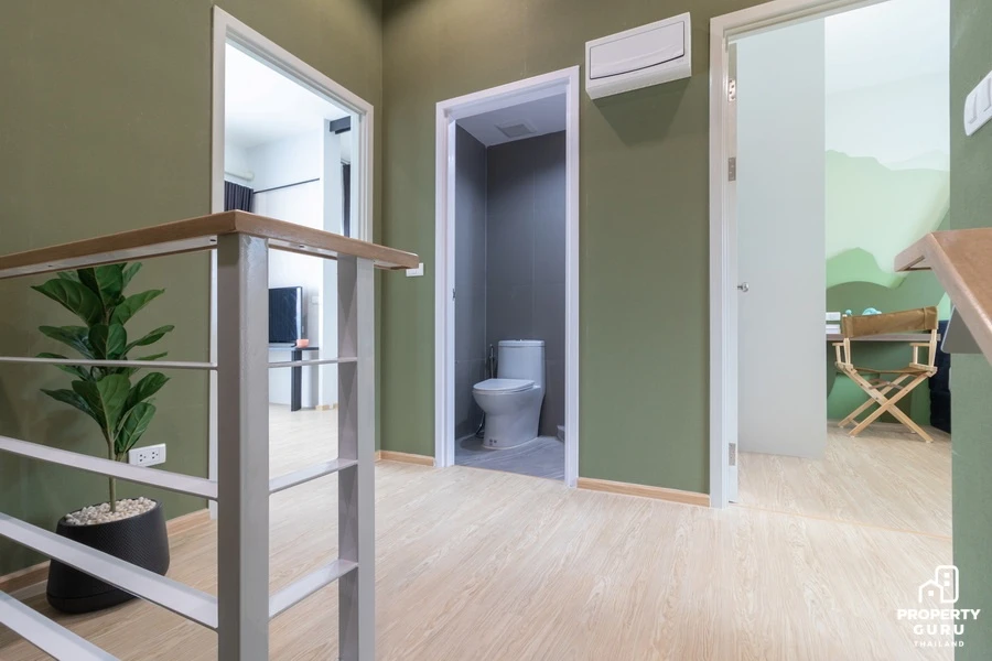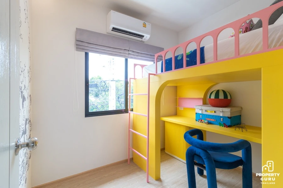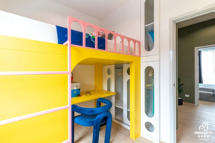ทางโครงการตกแต่งโดยการเลือกใช้เตียง 2 ชั้นแบบมีบันได และออกแบบพื้นที่บริเวณชั้นล่างเป็นโซนนั่งเรียนหนังสือ ถือเป็นการใช้พื้นที่ใช้งานแนวดิ่งได้อย่างคุ้มค่า และช่วยทำให้ห้องเหลือพื้นที่กว้างมากขึ้นราคาเริ่มต้น : 3.6 ล้านบาท