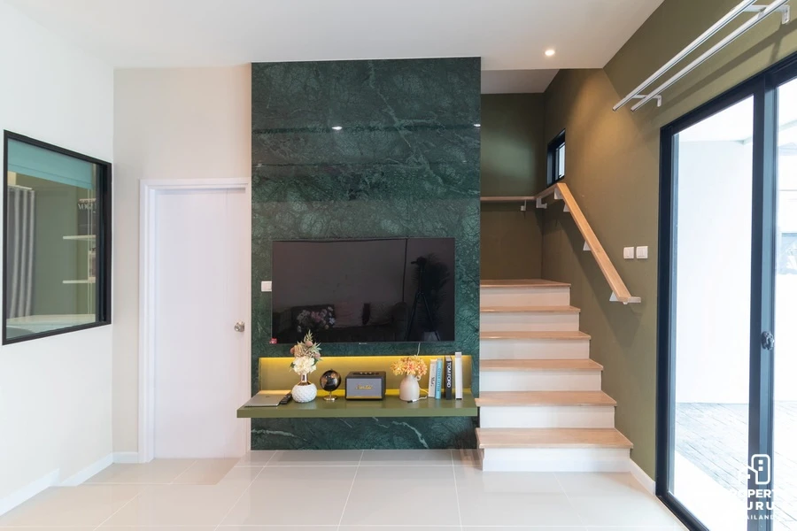 ฝั่งตรงข้ามเป็นตำแหน่งของชั้นวางทีวี ได้ระยะดูทีวีกว้างมากสามารถติดตั้งทีวีขนาดใหญ่ได้เลย