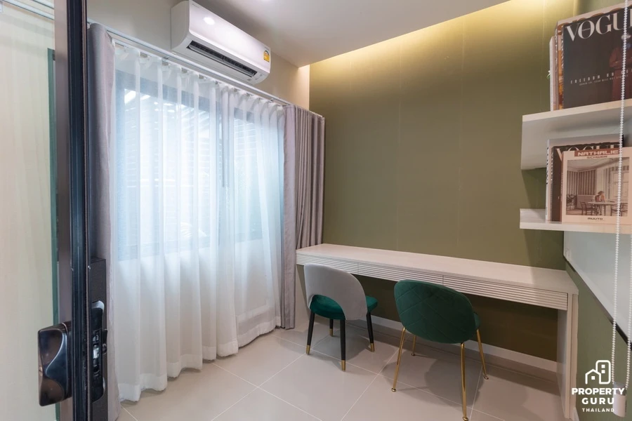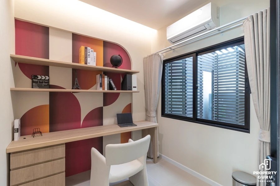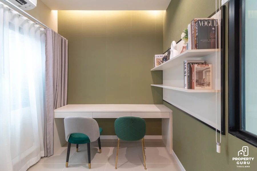ที่บ้านตัวอย่างออกแบบเป็นห้องทำงานมาให้ดูเป็นไอเดีย สามารถวางโต๊ะทำงานขนาด 2 ที่นั่ง และบริเวณผนังยังเหลือพื้นที่สำหรับ Built-in เป็นชั้นวางหนังสือ หรือชั้นวางของได้อีก
