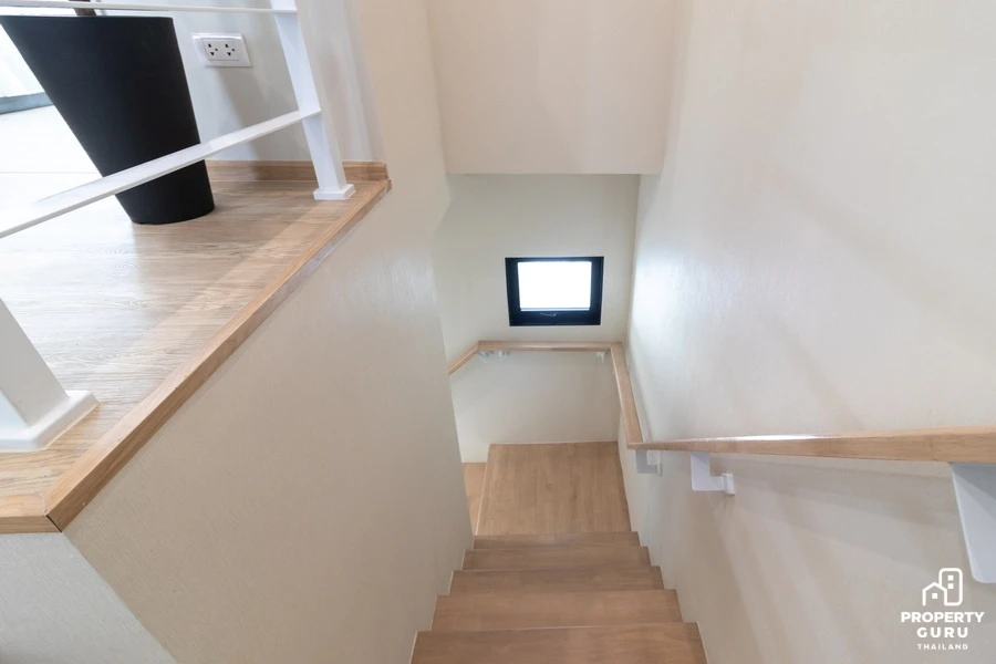 บันไดโครงการเป็นคอนกรีตเสริมเหล็ก ที่ผนังบริเวณชานพักเจาะเป็นช่องสำหรับให้แสงธรรมชาติผ่านเข้ามายังตัวบ้านได้ ทำให้เวลากลางวันบ้านสว่างโดยไม่ต้องเปิดไฟ