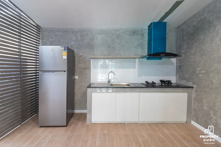 บ้านตัวอย่างออกแบบให้ห้องครัวอยู่บริเวณพื้นที่ซักล้าง หมดกังวลเรื่องกลิ่นรบกวนส่วนพักอาศัย เพราะกั้นเป็นสัดส่วนด้วยประตูกระจกบานเลื่อน 2 ตอน
