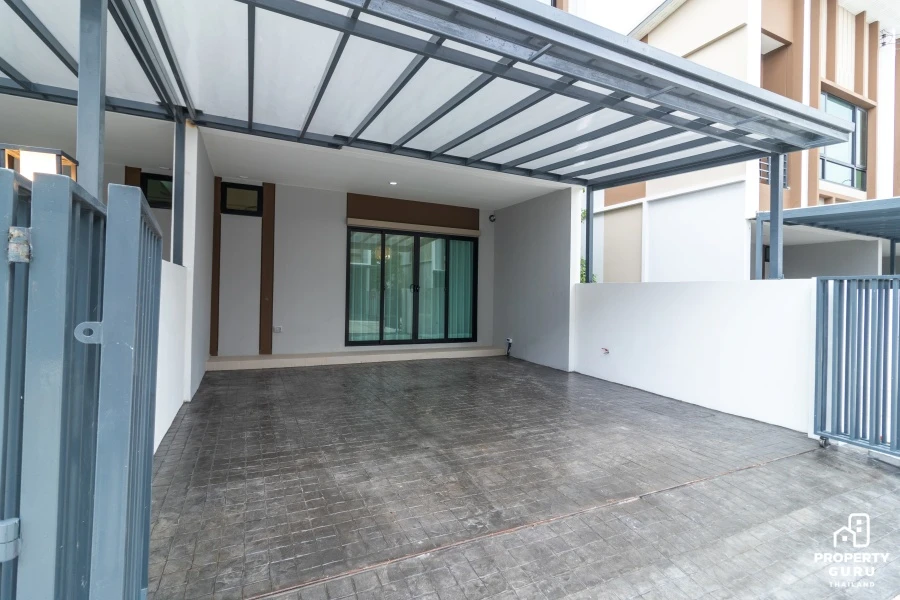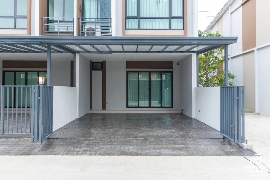 ตัวบ้านมีดีไซน์ทันสมัยในโทนสีน้ำตาล-ครีม หน้าบ้านกว้าง 5.2 เมตร จอดรถได้ 2 คัน