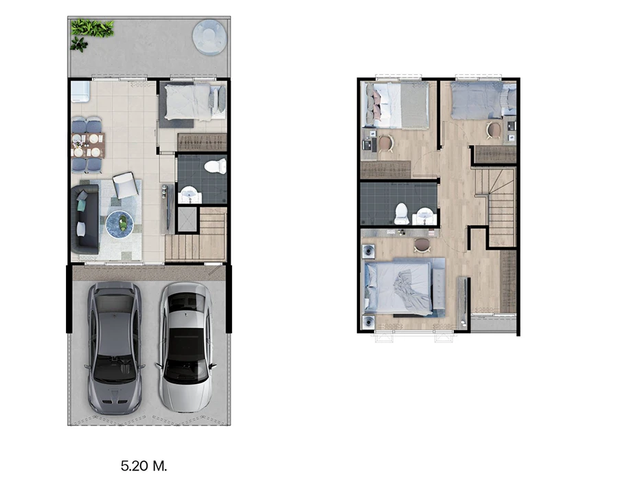 ฟังก์ชันการใช้งานบนชั้น 2 ประกอบด้วย 3 ห้องนอน และ 2 ห้องน้ำ