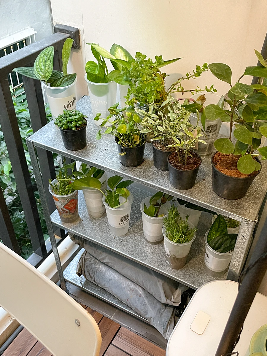 ชั้นวางต้นไม้และอุปกรณ์ที่ช่วยตกแต่งบรรยากาศให้เหมือนอยู่ในสวนมากขึ้น แถมยังช่วยเพิ่มความเป็นระเบียบวางเครื่องมือที่ใช้ในการดูแลต้นไม้ หรือเก็บของต่างๆ ตรงระเบียงได้อีกด้วย