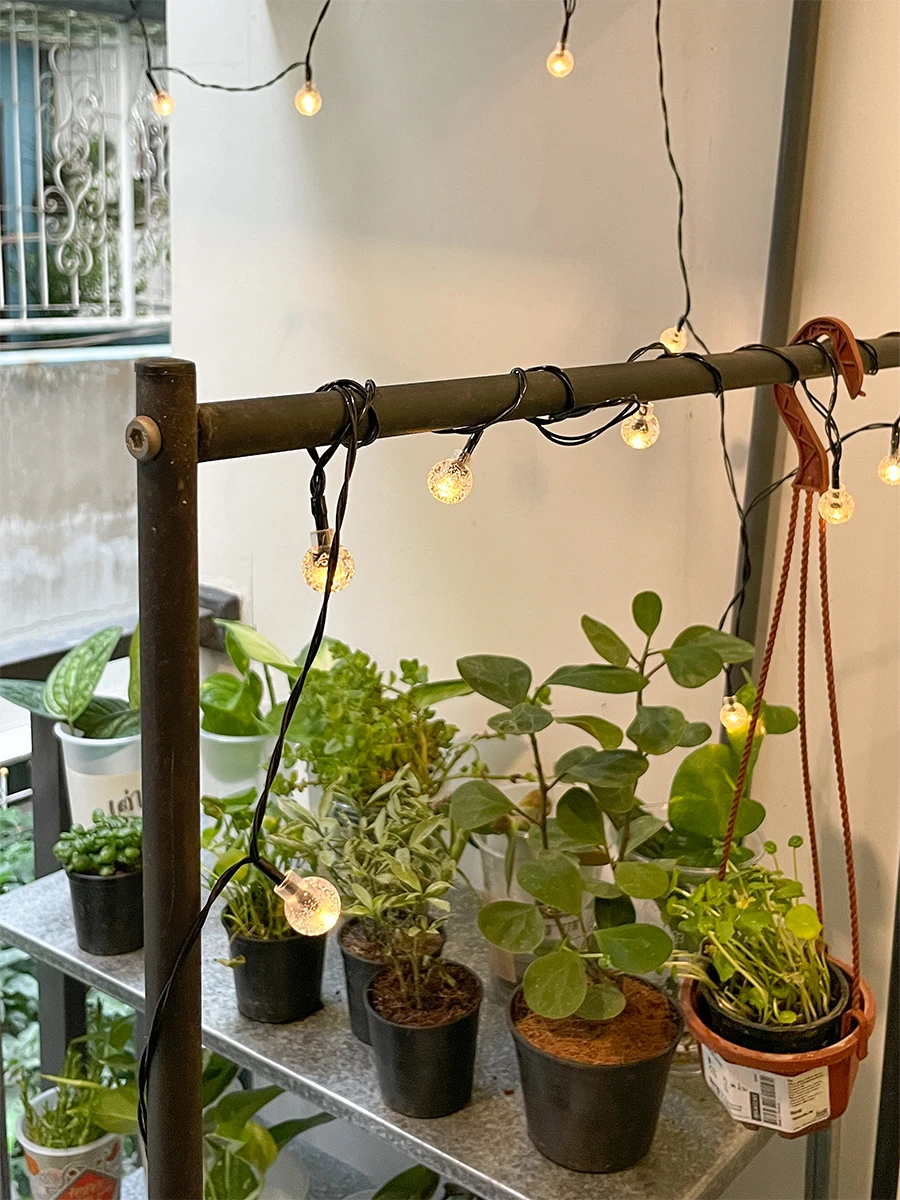 ตกแต่งระเบียงยามค่ำคืนด้วยไฟตกแต่ง ประหยัดไฟเพราะเป็นไฟโซล่าเซลล์รับพลังงานแสงอาทิตย์ ชาร์จเก็บไฟในตอนกลางวัน และเปิดปิดเองอัตโนมัติในตอนกลางคืน ช่วยเพิ่มบรรยากาศสุดโรแมนติกในระเบียง