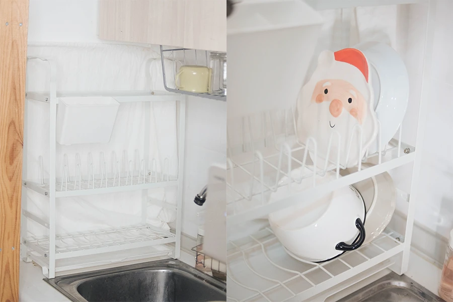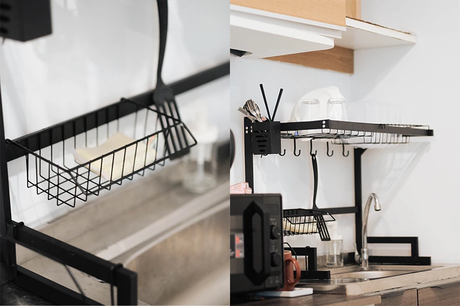ใครมีพื้นที่ครัวและอ่างล้างจานกว้างหน่อย ต้องจัดอันนี้แล้ว ชั้นวางจานคร่อมอ่าง สามารถวางคร่อมอ่างล้างจานได้ทั้งหมด เวลาคว่ำจานน้ำจากจานชามก็จะหยดลงมาบนอ่างเองเลย สะดวกสุดๆ แถมยังมีที่แขวนตะหลิว และที่วางฟองน้ำล้างจานให้อีกด้วย ครบเครื่องในชั้นเดียว