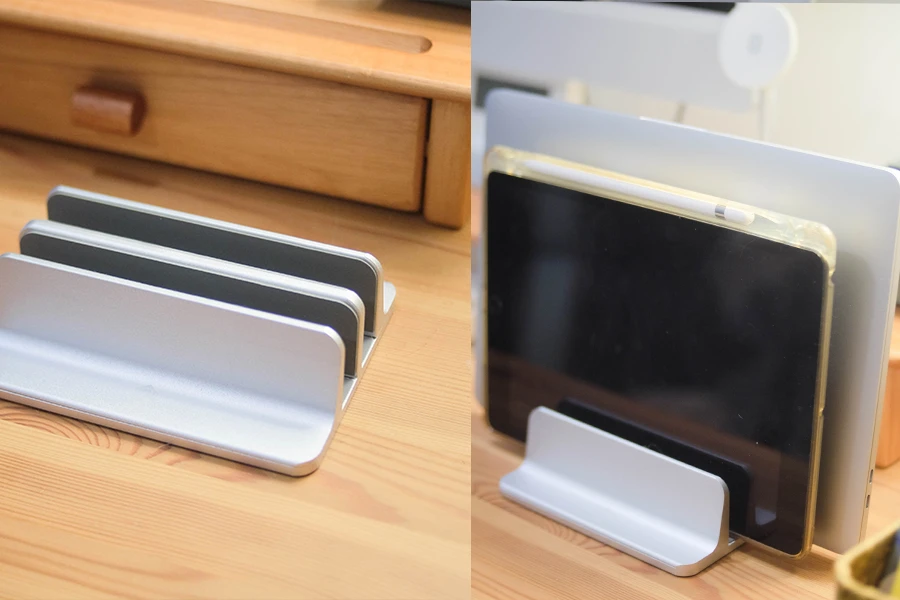 ยุคนี้หลายคนมีอุปกรณ์ทำงานหลายรูปแบบ ทั้งแล็ปท็อป แท็บเล็ต e-reader สามารถใช้แท่นวาง 2 ช่องแบบนี้ ช่วยวางอุปกรณ์ในแนวตั้งไม่เปลืองพื้นที่โต๊ะทำงาน มีแถบยางขนาดใหญ่นาบกับพื้นทั้งแผ่นไม่ต้องกลัวล้ม