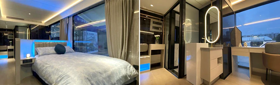แม้บ้านแคปซูลจะมีขนาดกะทัดรัด แต่ก็ถูกออกแบบมาให้ทุกพื้นที่มีฟังก์ชันที่จำเป็นต่อการใช้งานได้อย่างครบถ้วน ไม่ต่างจากการอยู่บ้าน และยังมาพร้อมเทคโนโลยีสุดล้ำ อาทิ ระบบสั่งงานด้วยเสียงอัจฉริยะ ที่ควบคุมการเปิด/ปิดไฟ และอุปกรณ์ต่างๆ เช่น ม่านกั้นแสง ไฟสร้างบรรยากาศ ไฟเตียง ไฟด้านนอก ไฟทางเดิน เครื่องปรับอากาศ และลำโพง เรียกว่าใช้ทุกพื้นที่ได้อย่างคุ้มค้า