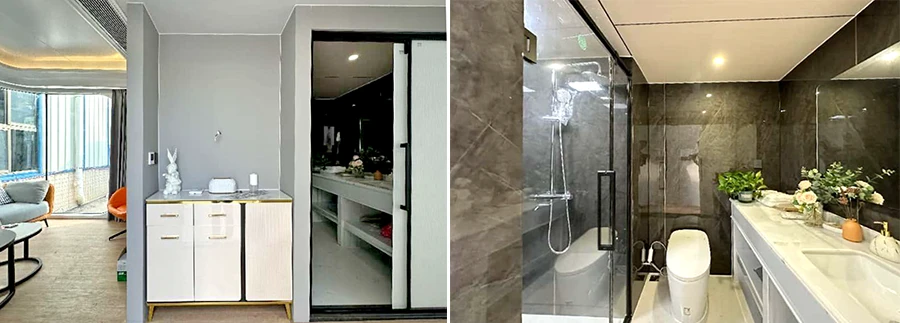 - พื้นห้องวัสดุเป็นพื้นหินอ่อน / กระเบื้องสำหรับห้องน้ำแผ่นใหญ่