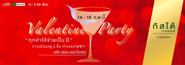 บริษัท กัสโต้ วิลเลจ จำกัด ในเครือ บริษัท ควอลิตี้เฮ้าส์ จำกัด (มหาชน) ได้จัดโปรโมชั่นพิเศษกับโครงการ กัสโต้ แกรนด์ รามคำแหง พบกับโปรโมชั่นพิเศษ 14-15 ก.พ.นี้ "Valentine Party" ทาวน์โฮมหรู 3 ชั้น ทำเลรถไฟฟ้า "ทุกค่าใช้จ่ายเป็น 0 ฟรี! เฟอร์+แอร์ ทั้งหลัง" เริ่ม 3.59 ล้าน