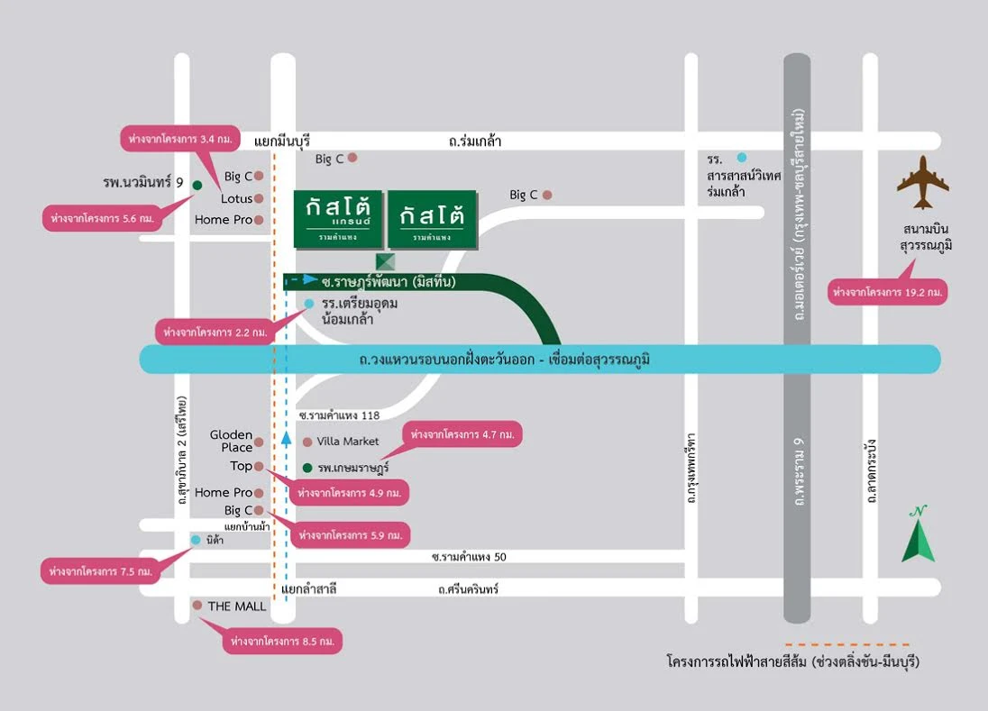 โครงการกัสโต้ แกรนด์ รามคำแหง (Gusto Grand Ramkhamhaeng) เดินทางสะดวก สามารถเข้า - ออกโครงการได้ 2 เส้นทาง คือ ถนนรามคำแหงเข้าแยกมิสทีน และถนนร่มเกล้า เข้าซอยร่มเกล้า 24 และในอนาคตจะมีโครงการรถไฟฟ้าสายสีส้ม ช่วงตลิ่งชัน-มีนบุรี โดยสถานีที่ใกล้ที่สุดคือสถานีราษฎร์พัฒนา ห่างจากโครงการประมาณ 800 เมตร ซึ่งคาดว่าน่าจะเปิดบริการได้ในปี พ.ศ. 2564 ค่ะ