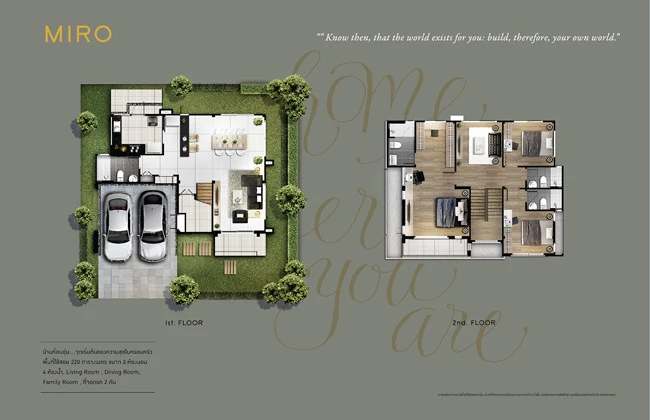 1. แบบบ้าน Miro พื้นที่ใช้สอย 220 ตร.ม 3 ห้องนอน 4 ห้องน้ำ ห้องรับแขก ห้องรับประทานอาหาร ห้องนั่งเล่น ที่จอดรถ 2 คัน