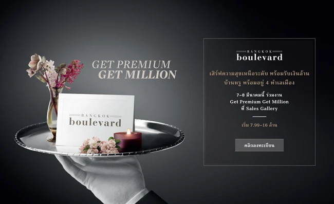บริษัท เอสซี แอสเสท คอร์ปอเรชั่น จำกัด (มหาชน) จัดแคมเปญสุดพิเศษ ในวันที่ 7-8 มีนาคม 2558 นี้ ด้วยการเปิดให้ครอบครองบ้านหรูพร้อมอยู่ พร้อมฟังก์ชันพิเศษ ภายใต้แบรนด์ บางกอก บูเลอวาร์ด ใน 4 ทำเล + โลเคชั่น ศักยภาพ ในงาน "Get Premium Get Million" พร้อมรับสิทธิพิเศษ มูลค่าสูงสุด 1 ล้านบาท* ที่ Sales Gallery ของแต่ละโครงการ