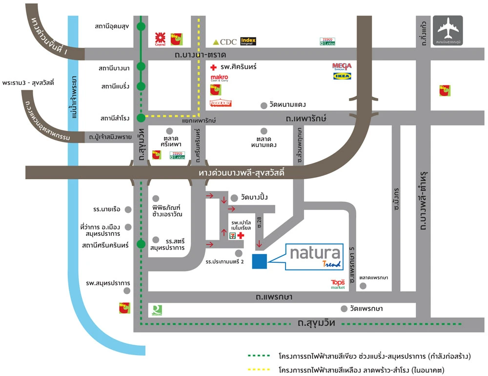 โครงการ เนเชอร่า เทรนด์ ศรีนครินทร์ ตั้งอยู่ในซอยทรัพย์บุญชัย 28 ตำบลบางเมือง อำเภอเมือง จังหวัดสมุทรปราการ สามารถเชื่อมต่อได้หลากหลายเส้นทาง เช่น ถนนสุขุมวิท, ถนนเทพารักษ์, ถนนศรีนครินทร์, และถนนบางนา-ตราด ใกล้จุดขึ้น-ลงถนนวงแหวนรอบนอกๆ เส้นวงแหวนอุตสาหกรรมใกล้สุวรรณภูมิ และในอนาคตสามารถเดินทางสู่เส้นทางรถไฟฟ้าสายสีเขียว สำโรง-ปากน้ำ และโครงการรถไฟฟ้าสายสีเหลือง ช่วงพัฒนาการ-สำโรง ได้สะดวกรวดเร็วยิ่งขึ้นอีกด้วย ในส่วนของสถานที่สำคัญรอบๆ โครงการ รายล้อมไปด้วยสิ่งอำนวยความสะดวกต่างๆ อาทิ โรงพยาบาลเปาโล ศรีนครินทร์ สถานศึกษา หน่วยงานราชการ แหล่งช็อบปิ้ง อย่าง Robinson, Tesco Lotus, Big C, Tops และแหล่งสันทนาการ เป็นต้น