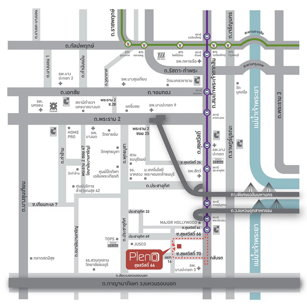 พลีโน่ สุขสวัสดิ์ 66 (Pleno Suksawat 66) พรีเมียมทาวน์โฮม 2 ชั้นใหม่ สไตล์ Modern Classic บ้านอบอุ่นที่ผสมผสานสดชื่น ให้คุณใช้ชีวิตสมบูรณ์แบบได้ในทุกวัน เต็มอิ่มทุกสัมผัสกับคลับเฮ้าส์ดีไซน์ทันสมัย พร้อมสระว่ายน้ำขนาดใหญ่เต็มอารมณ์ โปร่ง โล่ง สบายด้วยสวนส่วนกลางร่มรื่น พร้อมทางเดินต่อเนื่องรอบโครงการให้คุณได้เพลิดเพลินผ่อนคลาย อุ่นใจด้วยระบบรักษาความปลอดภัยตลอด 24 ชั่วโมง