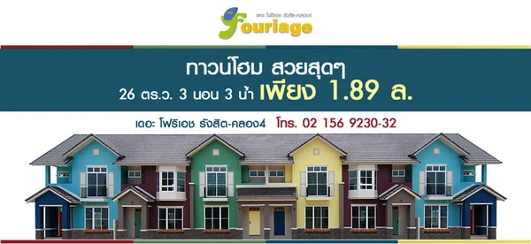 ทาวน์โฮม เดอะ โฟริเอช รังสิต-คลอง 4 ทาวน์โฮม 2 ชั้น เนื้อที่ 26 ตร.ว. ทาวน์โฮมดีไซน์ใหม่ 3 ห้องนอน 3 ห้องน้ำ จองวันนี้ ฟรีค่าโอน+จำนอง