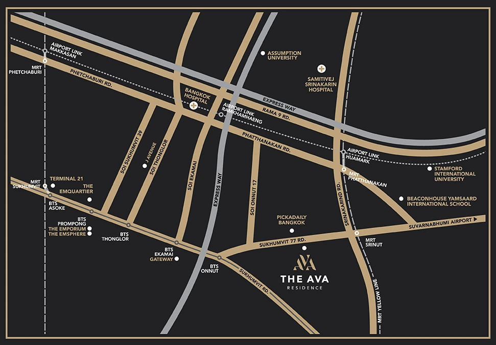 เชื่อมคุณสู่ทำเลสำคัญของเมือง เข้าออกได้ 2 เส้นทางหลัก ถนนสุขุมวิทและถนนศรีนครินทร์ เดินทางสะดวกด้วยรถไฟฟ้า BTS สายสุขุมวิทสถานีอ่อนนุช ห่างจากโครงการประมาณ 4.7 กม., Airport Link สถานีหัวหมาก ห่างจากโครงการประมาณ 3.9 กม. และรถไฟฟ้า MRT สายสีเหลือง ใกล้จุดขึ้นลงทางด่วนพระราม 9 และ สุขุมวิท 51 ใกล้แหล่งไลฟ์สไตล์สุดชิค อาทิ THE EMPORIUM, THE EMQUARTIER, THE EMSPHERE, J AVENUE ทองหล่อ, GATEWAY เอกมัย และ TERMINAL 21
