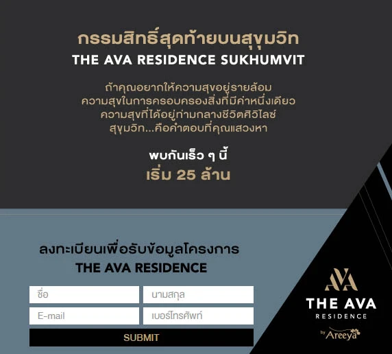 บริษัท อารียา พรอพเพอร์ตี้ จำกัด (มหาชน) เปิดให้ผู้ที่สนใจลงทะเบียนรับข้อมูลเพิ่มเติมและสิทธิพิเศษของโครงการ "ดิ เอวา เรสซิเดนซ์ สุขุมวิท (The AVA Residence Sukhumvit)" บ้านเดี่ยวสุดหรู 3 ชั้นสไตล์ Modern-Luxury พื้นที่ใช้สอยเริ่มต้นที่ 299 ตร.ม. ล้ำหน้าด้วยระบบ VDO CALL ติดต่อกับเจ้าของบ้านแบบ REAL TIME เพิ่มความปลอดภัยสูงสุดแก่ผู้อยู่อาศัย สาธารณูปโภคมีทั้งสวนสาธารณะสไตล์ EDEN GARDEN LINE, CLUBHOUSE, ฟิตเนส, และ SKY TERRACE บนที่สุดของชีวิตศิวิไลซ์ มอบความสุขให้อยู่รายล้อมชีวิตคุณ ครบครันความสะดวกสบาย กรรมสิทธิ์สุดท้ายบนถนนสุขุมวิท