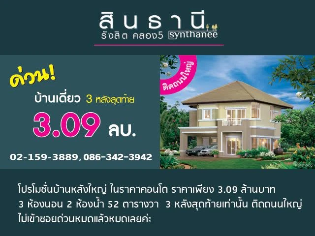 บริษัท สินธานี เอสเตท จำกัด ได้จัดโปรโมชั่นกับโครงการ "สินธานี แกรนด์วิลล์ รังสิต คลอง 5 (SynThanee Grandview)" ในแคมเปญ "โปรโมชั่นบ้านหลังใหญ่ ในราคาคอนโด ราคาเพียง 3.09 ล้านบาท 3 ห้องนอน 2 ห้องน้ำ 52 ตารางวา 3 หลังสุดท้ายเท่านั้น" ติดถนนใหญ่ ไม่เข้าซอย ด่วน! หมดแล้วหมดเลยค่ะ