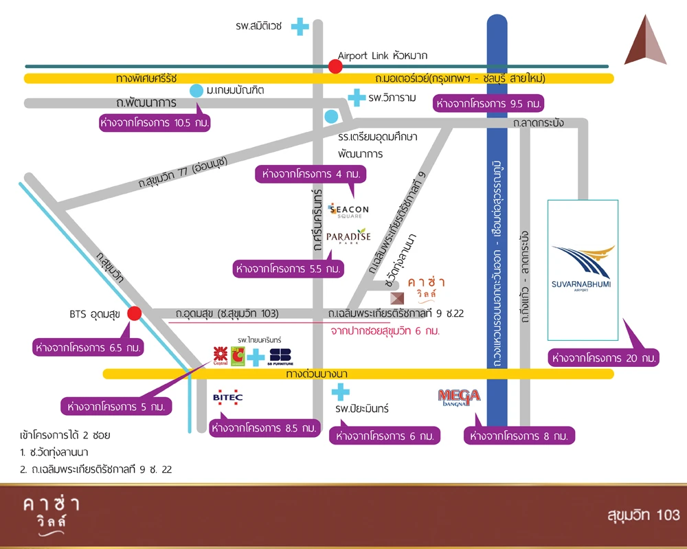 โครงการคาซ่า วิลล์ สุขุมวิท 103 ตั้งอยู่บนถนนเฉลิมพระเกียรติ ร.9 ซอย 22 แขวงหนองบอน เขตประเวศ กรุงเทพมหานคร ทำเลคุณภาพเชื่อมต่อถนนสุขุมวิท สามารถเดินทางได้หลากหลายเส้นทาง ซอยสุขุมวิท 103 (อุดมสุข), ซอยสุขุมวิท 77 (อ่อนนุช) ถนนศรีนครินทร์, ถนนบางนาตราด ใกล้แหล่งอำนวยความสะดวก อาทิ ห้างสรรพสินค้า พาราไดซ์ ศรีนครินทร์, ห้างสรรพสินค้าเซ็นทรัล บางนา, โรงเรียนนานาชาติชาร์เตอร์, โรงพยาบาลสิรินธร และแหล่งชิลเอาท์กลางเมือง