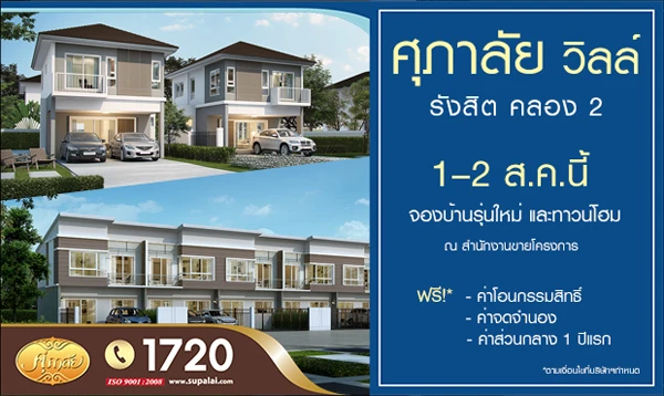 ศุภาลัย วิลล์ รังสิต คลอง 2 โครงการบ้านรุ่นใหม่ และทาวน์โฮม Modern Style ริมถนนรังสิต - นครนายก แวดล้อมด้วยสิ่งอำนวยความสะดวกครบครัน เดินทางสะดวก ใกล้ถนนวิภาวดีรังสิต ทางด่วนดอนเมือง - โทลล์เวย์ ถนนกาญจนาภิเษก ใกล้รถไฟฟ้ารถไฟฟ้า สายสีเขียวเข้ม สถานีคูคต / รถไฟฟ้า สายสีแดง