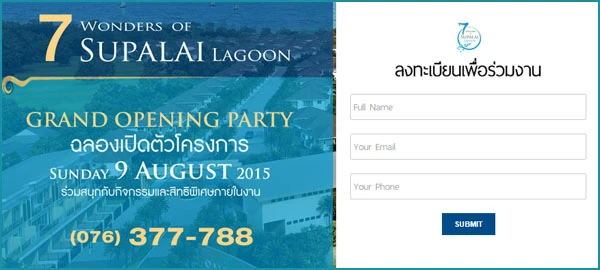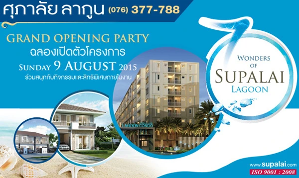 เชิญร่วมงาน Supalai Lagoon Grand Opening Party ในวันอาทิตย์ที่ 9 สิงหาคม 2558 นี้ เวลา 9.30-18.30 น. ณ ศุภาลัย ลากูน ถนนเทพกระษัตรี ใกล้แยกบางคู พบกับดนตรีแบบสบายๆ ร่วมสนุกกับกิจกรรมและสิทธิพิเศษภายในงาน และลุ้นรับรางวัลพิเศษจากศุภาลัย