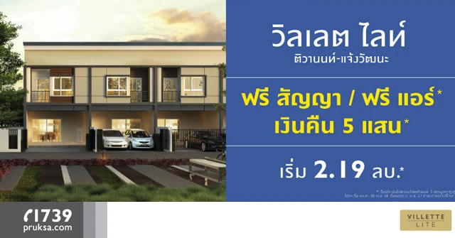 บริษัท พฤกษา เรียลเอสเตท จำกัด (มหาชน) จัดโปรโมชั่น โครงการ "วิลเลต ไลท์ ติวานนท์-แจ้งวัฒนะ (Villette Lite Tiwanon-Chaengwattana)" 8-9 สิงหาคมนี้ พบข้อเสนอพิเศษสุด ฟรีสัญญา, ฟรีแอร์, พร้อมรับเงินคืน 5 แสน* และพิเศษสุด เมื่อจองในงานรับเพิ่มฟรี แอร์ทุกห้องนอน