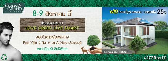 บริษัท เสนาดีเวลลอปเม้นท์ จำกัด (มหาชน) เชิญสัมผัสชีวิต ECO Life ในงาน Love Green Live Smart ที่จะจัดขึ้นในวันเสาร์ที่ 8 และวันอาทิตย์ที่ 9 สิงหาคม 2558 นี้ โดยงานจะจัดขึ้นตั้งแต่เวลา 10.00 - 17.00น. ที่โครงการ เสนาพาร์ค แกรนด์ รามอินทรา ร่วมชิม ดื่ม ผ่อนคลาย กับอาหาร Healthy Clean Food พร้อมทำ Spa ในบรรยากาศบ้านเดี่ยวแสนสงบที่สามารถสร้างรายได้ให้กับคุณกว่า 1 ล้านบาท ด้วยที่สุดแห่งนวัตกรรม Solar Roof แบบเดียวกับที่บริษัท Apple เลือกใช้ พร้อมรับเอกสิทธิ์ขายพลังไฟฟ้ายาวนานถึง 25 ปี กับทางภาครัฐ ที่เสนามอบให้กับคุณฟรี
