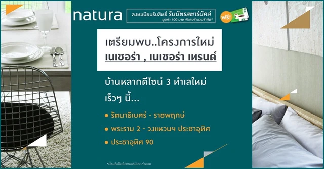 บริษัท พฤกษา เรียลเอสเตท จำกัด (มหาชน) เตรียมเปิดตัวบ้านเดี่ยวโครงการใหม่ภายใต้แบรนด์ เนเชอร่า และ เนเชอร่า เทรนด์ บ้านเดี่ยวหลากดีไซน์ ใน 3 ทำเลศักยภาพ ได้แก่ รัตนาธิเบศร์ - ราชพฤกษ์, พระราม 2 - วงแหวน ฯ ประชาอุทิศ, และ ประชาอุทิศ 90 โดยเปิดให้ลงทะเบียนผ่านเว็บไซต์ เพื่อรับสิทธิพิเศษก่อนใคร พร้อมทั้งรับบัตรสตาบัคส์ ฟรีมูลค่า 100 บาท พิเศษจำนวนจำกัด*