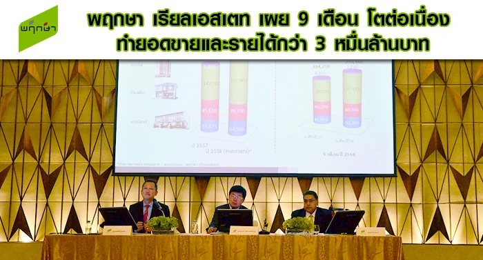 บริษัท พฤกษา เรียลเอสเตท จำกัด (มหาชน) โชว์ผลประกอบการ 9 เดือน กวาดยอดขาย 34,455 ล้านบาท รายได้ 33,211 ล้านบาท เติบโตเพิ่มขึ้น 10% และ 9.3% ตามลำดับ โดยเชิญสื่อมวลชนเข้าร่วมรับฟังการแถลงผลประกอบการไตรมาส 3 ประจำปี 2558 เมื่อวันศุกร์ที่ 13 พฤศจิกายน 2558 ณ ห้องฉัตราบอลรูม 2 โรงแรมสยามเคมปินสกี้