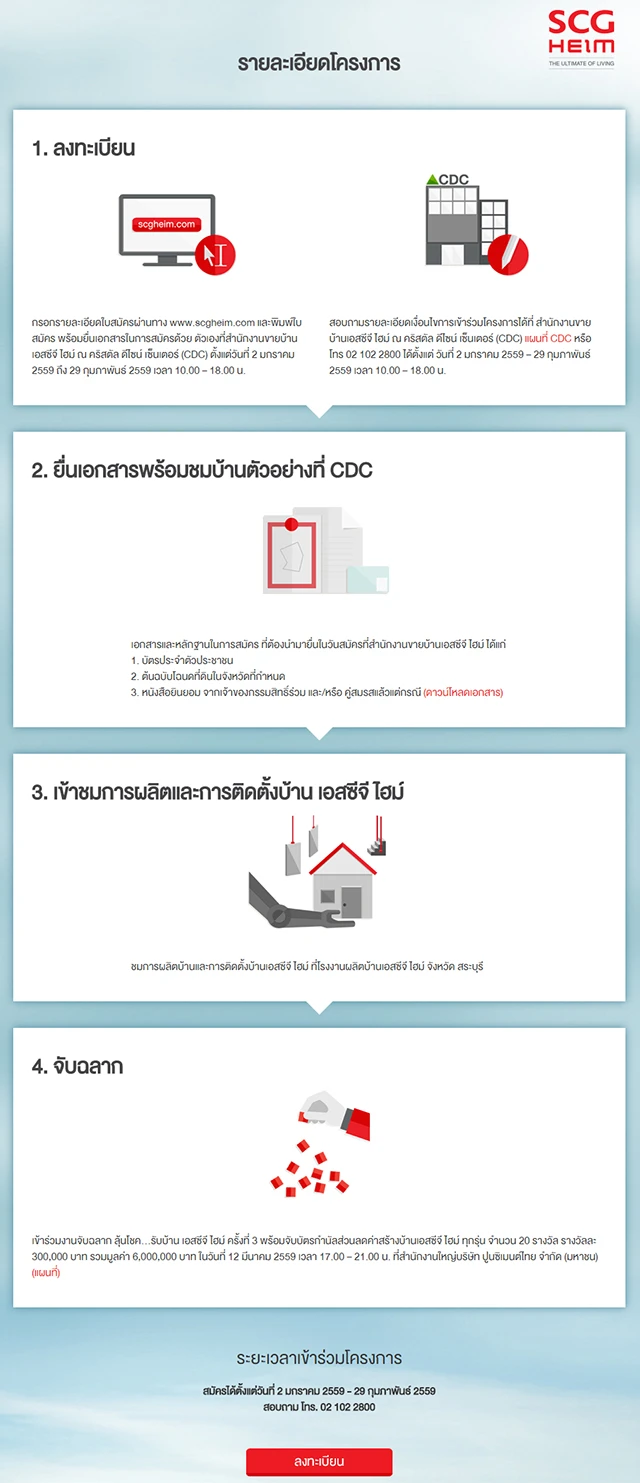 ลุ้นโชครับบ้าน SCG HEIM จากบริษัท SCG ได้แล้ววันนี้ สมัครได้ตั้งแต่วันที่ 2 ม.ค. - 29 ก.พ. 2559 ที่ www.scgheim.com สอบถามรายละเอียดเพิ่มเติม โทร. 02-102-2800