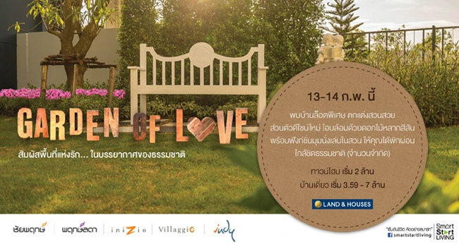 บริษัท แลนด์ แอนด์ เฮ้าส์ จำกัด (มหาชน) จัดแคมเปญพิเศษ "Garden of Love" สัมผัสพื้นที่แห่งรัก... ในบรรยากาศของธรรมชาติ เริ่มต้นชีวิตสมาร์ทกับบ้านคุณภาพ ล็อตพิเศษ ตกแต่งสวนสวย ส่วนตัวดีไซน์ใหม่ โอบล้อมด้วยดอกไม้หลากสีสันต้อนรับเทศกาลแห่งความรัก พร้อมฟังก์ชั่นมุมนั่งเล่นในสวน ให้คุณได้พักผ่อน ใกล้ชิดธรรมชาติ (จำนวนจำกัด) 12 โครงการ ทาวน์โฮม เริ่ม 2 ล้าน บ้านเดี่ยว เริ่ม 3.59 - 7 ล้าน ตั้งแต่วันที่ 13 - 14 กุมภาพันธ์นี้