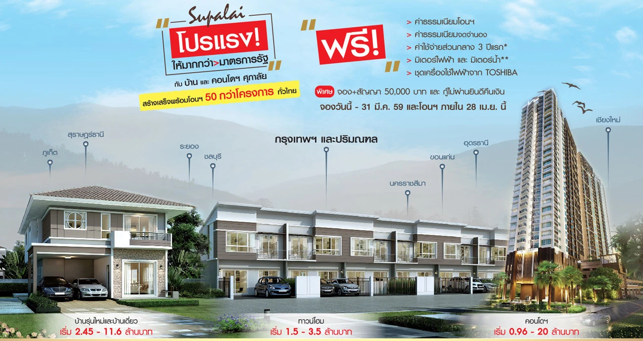 บริษัท ศุภาลัย จำกัด (มหาชน) จัดโปรโมชั่นพิเศษสุดแรง ให้มากกว่ามาตรการรัฐ กับบ้านเดี่ยว, ทาวน์โฮม, และคอนโดฯ สร้างเสร็จพร้อมโอนฯ 50 กว่าโครงการทั่วไทย สำหรับโปรโมชั่นสุดพิเศษได้แก่ ฟรี! ค่าธรรมเนียมโอน, ค่าธรรมเนียมจดจำนอง ค่าใช้จ่ายส่วนกลาง 3 ปีแรก*, มิเตอร์ไฟฟ้า และ มิเตอร์น้ำ** และชุดเครื่องใช้ไฟฟ้าจาก TOSHIBA พิเศษ จอง และทำสัญญาเพียง 50,000 บาท และกู้ไม่ผ่านยินดีคืนเงิน สำหรับผู้ที่สนใจสามารถเข้าไปจองได้ที่สำนักงานขายของโครงการ ตั้งแต่วันนี้เป็นต้นไปจนถึง 31 มีนาคม 2559 และโอนภายใน 28 เมษายนนี้ โดยโครงการที่เข้าร่วมโปรโมชั่นแบ่งตามทำเลทั่วประเทศ มีดังต่อไปนี้