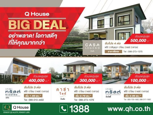 บริษัท ควอลิตี้ เฮ้าส์ จำกัด (มหาชน) จัดโปรโมชั่น "BIG DEAL" พบบ้านเดี่ยวและทาวน์โฮม 4 โครงการ ส่วนลดพิเศษ พร้อมรับโปรโมชั่น 3 ต่อ หรือ 4 ต่อ ฟรี! สัญญา, โอน, แอร์ หรือดาวน์ อย่าพลาดโอกาสดีๆ ที่ให้คุณมากกว่า