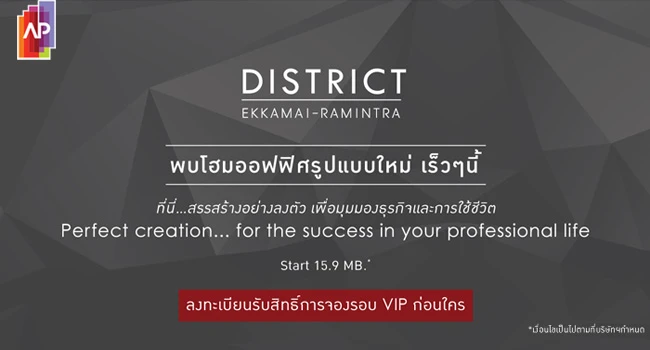 เตรียมพบกับโฮมออฟฟิศใหม่จาก AP "ดิสทริค เอกมัย - รามอินทรา (DISTRICT Ekkamai - Ramintra)" โฮมออฟฟิศรูปแบบใหม่ ตั้งอยู่บนทำเลศักยภาพ เอกมัย-รามอินทรา ที่จะทำให้จังหวะชีวิต และมุมมองธุรกิจเป็นหนึ่งเดียว โดยเปิดให้ลงทะเบียนเพื่อรับสิทธิการจองรอบ VIP ก่อนใคร และเตรียมเปิดให้จองเร็วๆ นี้
